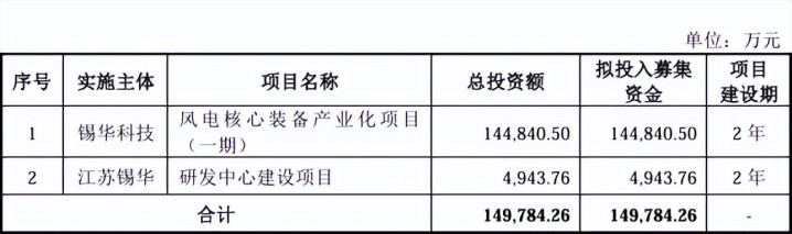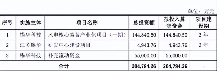 此次IPO,锡华科技计划拟募资14.98亿元,其中募投计划的96%即14.48亿元用于风电核心装备产业化项目(一期);4943.76万元用于研发中心建设项目。然而,这一募资金额较初次递表时募资金额已然被砍掉了5.5亿元的补流项目。