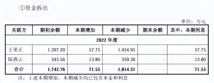2022年,于实际控制人个人资金需求,公司曾存在向实际控制人或其指定的对手方拆出资金的情形,具体用于投资理财、向近亲属提供借款用于购置房产等用途。2022年,拆借给实控人王荣正、陆燕云的资金期初合计1742.76万元,本期利息71.55万元。